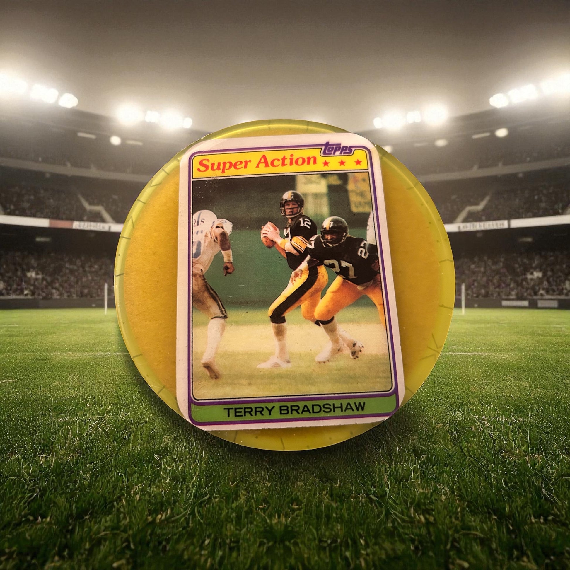 Elevate your game day experience with the Terry Bradshaw football coaster. This 4" x 4" coaster features a vintage authentic NFL card of the legendary Bradshaw, handcrafted with durable resin. Enhance your collection with this one-of-a-kind piece and show off your love for the game in style.